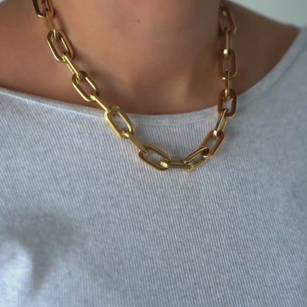 The Elle Gage Necklace features a thick gauge chain crafted from 18k gold-plated stainless steel. Non-tarnishing, water-resistant, and hypoallergenic, it's designed for daily wear and perfect for stacking with your favorite pieces.