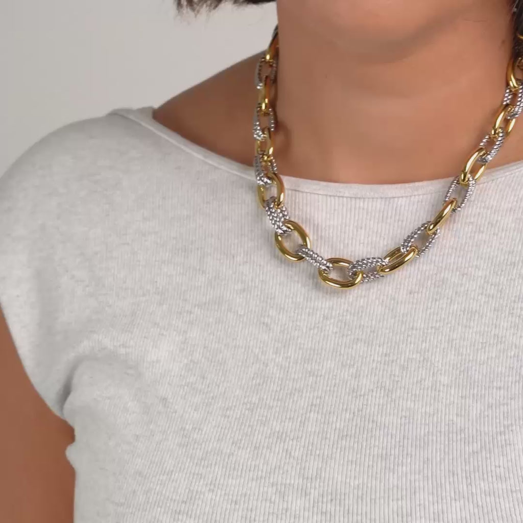 Make a bold statement with the Roxy Two-Tone Necklace. Featuring a chunky gauge chain and an effortlessly cool mix of gold and silver tones, this piece brings strength and style to any neck stack. Its water and tarnish-resistant finish means you can wear it from day to night, season after season. Modern, versatile, and designed for impact.